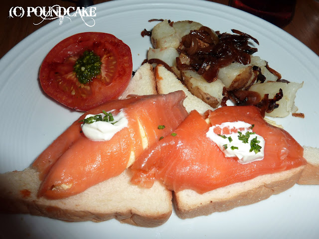 salmon to go along with my eggs. As my friend and I went at the time of dinner, some little non-breakfast course would be great to go along with our eggy meal. The salmon were fresh as I could taste the freshness with a little bite and the potatoes were the better quality ones that could stand on its on. The idea of the two toast below those salmon-wrapped eggs were interesting as I can eat them together as one, like how you eat a burger. Yet again, the tomatoes were fresh. Totally juicy and I liked the way they grilled it. :)
